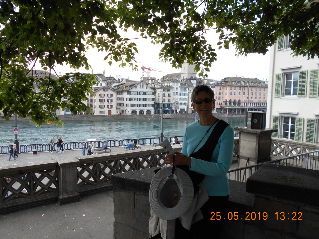 Zurich has turned out to be a great first destination for our trip. We’ve walked ourselves stupid (as usual) in the Old Town’s twisting, hilly streets with tiny fountained squares around every corner, taken a boat down long Lake Zurich to the 12th Century castle as Rapperswil, and climbed up to the university terrace overlooking Zurich Old Town just for the view. And our legs have not yet forgiven us for yesterday’s climb up old, worn stone steps inside one of the church towers for wonderful views directly over the top of the city and lake (see the two towers at the far right in the photo). It was at least gratifying to realise that the gorgeous young things that followed us up the church tower were just as exhausted at the top. Standing on a narrow ledge 10 stories up a five century-old old church tower is a smidge outside my comfort zone, but it was worth it.