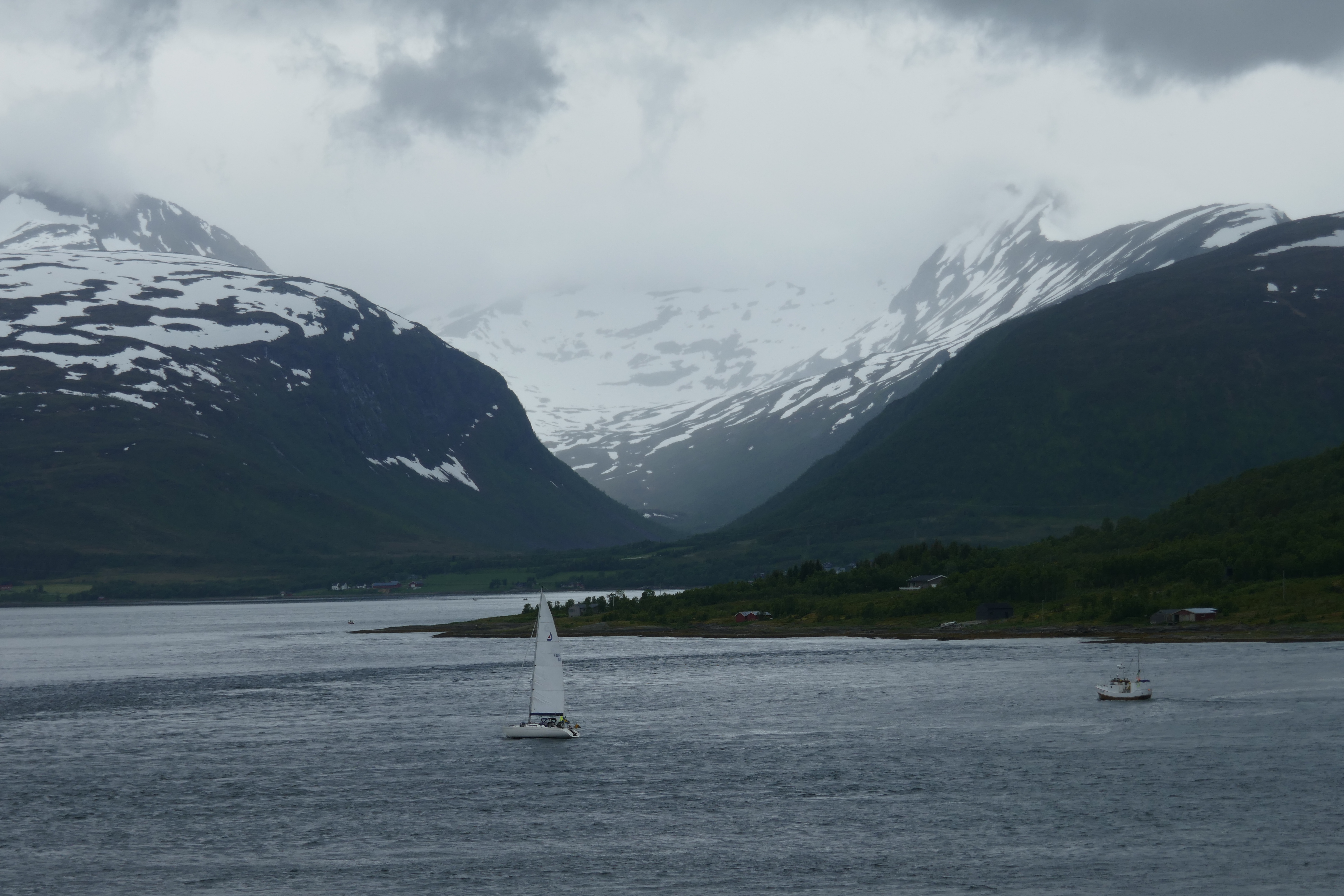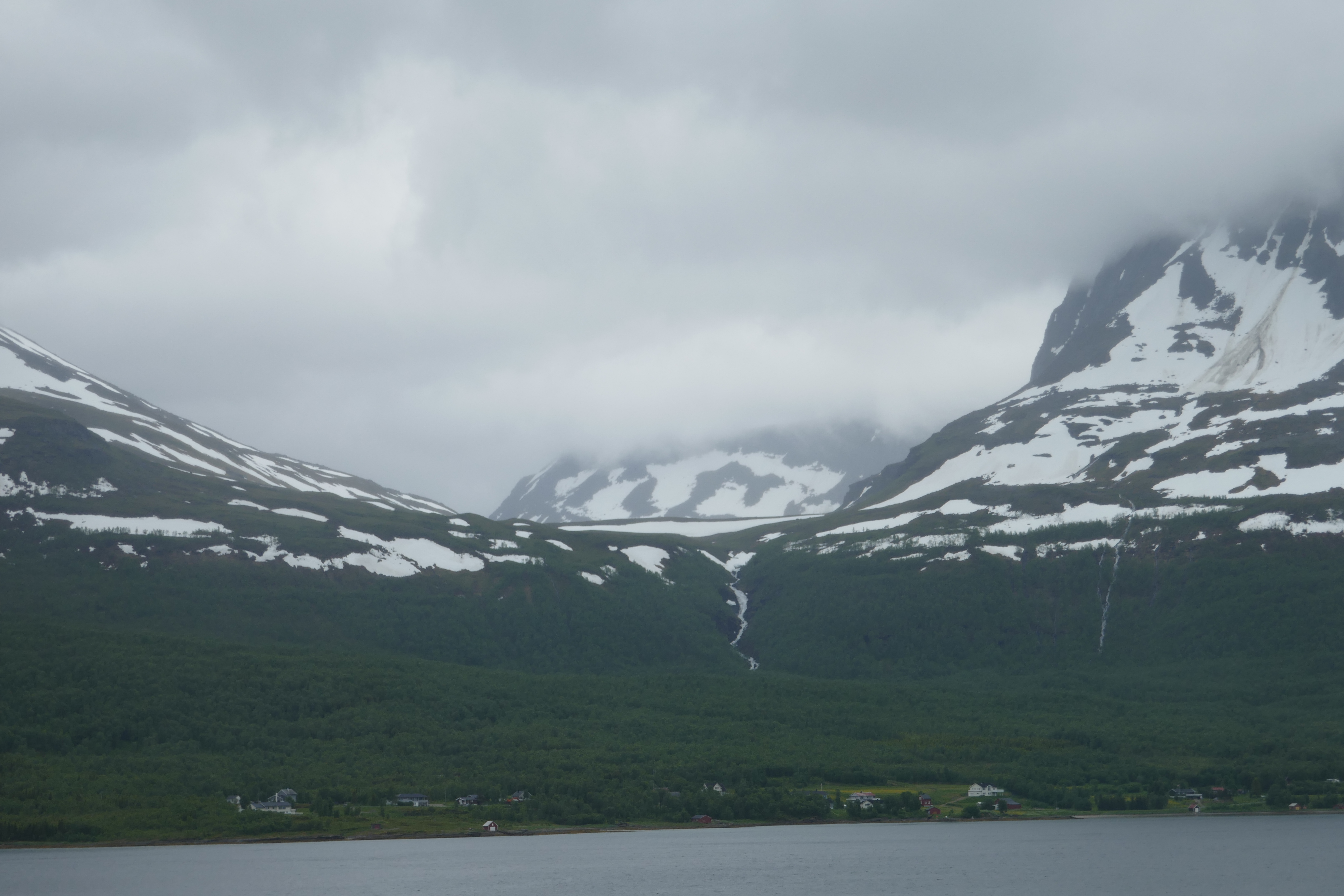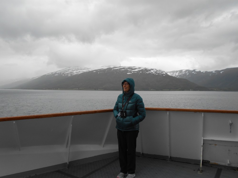 We really enjoyed yesterday, despite it being our second day of unremitting gloom. Weaving our way through the islands and fjords north of the Lofotens on our way to Tromso, the high ridges and mountains alongside us darkly muted, monotoned by cloud and mist, and hauntingly beautiful. Mountains have many moods, it seems.