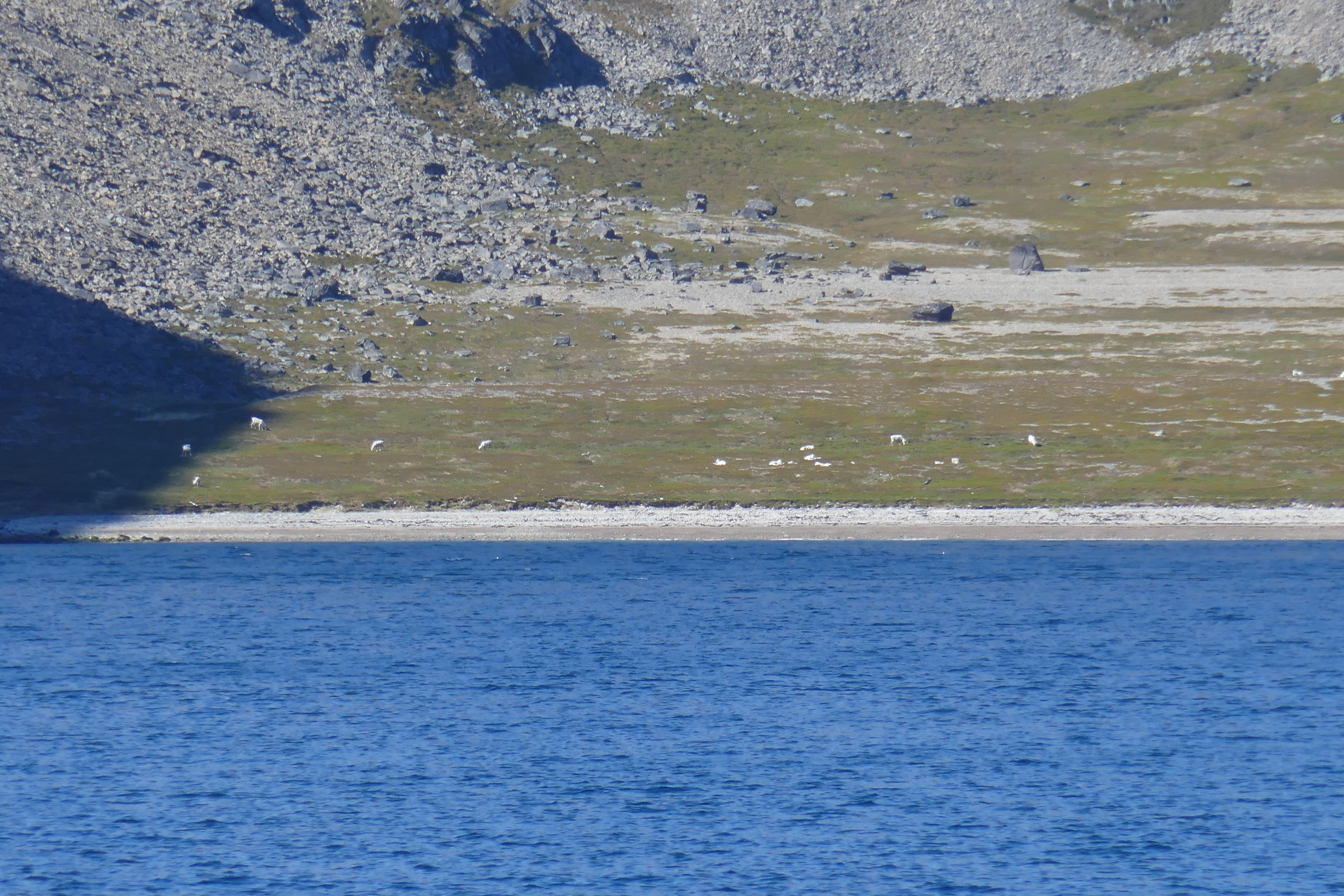 The little itty-bitty white dots near the shoreline are grazing reindeer. They were surprisingly white, and at this distance looked like long-legged sheep. Apparently, most reindeer herds are still seasonally managed by the indigenous Sami people of far northern Scandinavia (formerly called Laplanders).